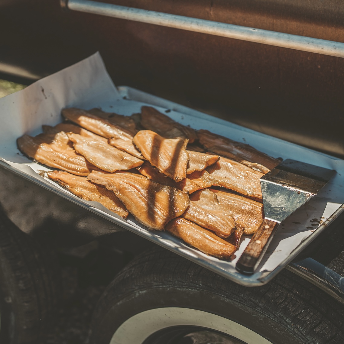 Brined for 24 hours and smoked on applewood at 250 degrees, this smoked trout is 100% cooked and ready to serve. It's great for reheating and serving warm or adding it as a topping to your favorite salad or as a spread on a bagel. Enjoy!